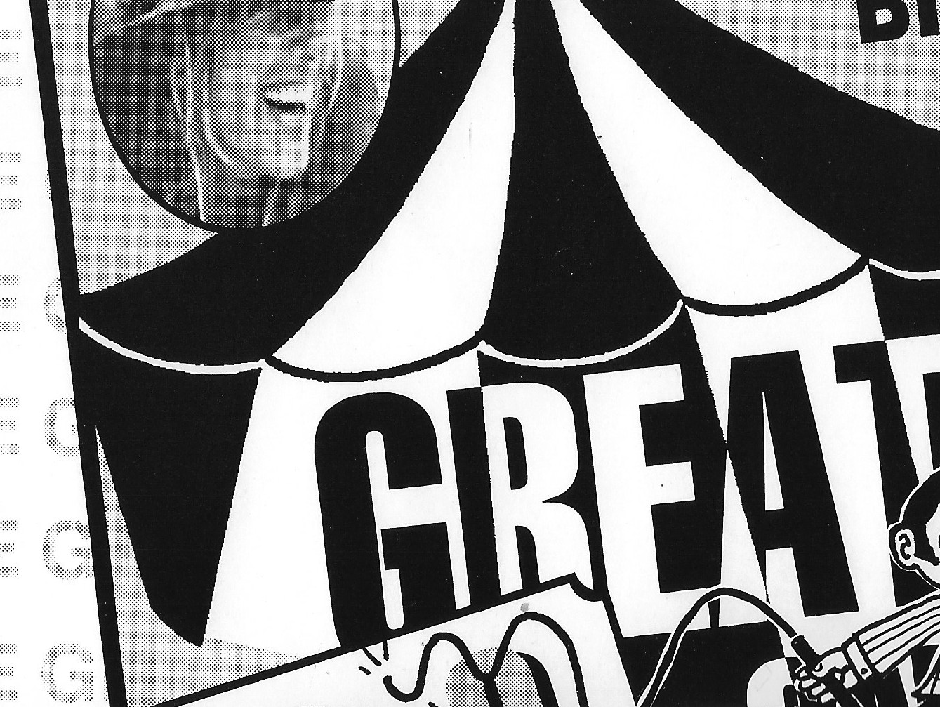 A small portion of a demo ad showing the sorts of page elements that could be supported: halftones, line graphics, type at arbitrary sizes and angles, drop shadows, halftone greyscale fill of objects, etc. This is a 1000dpi original scanned at 300dpi (the best my scanner can do) so the halftone quality is not adequately represented.