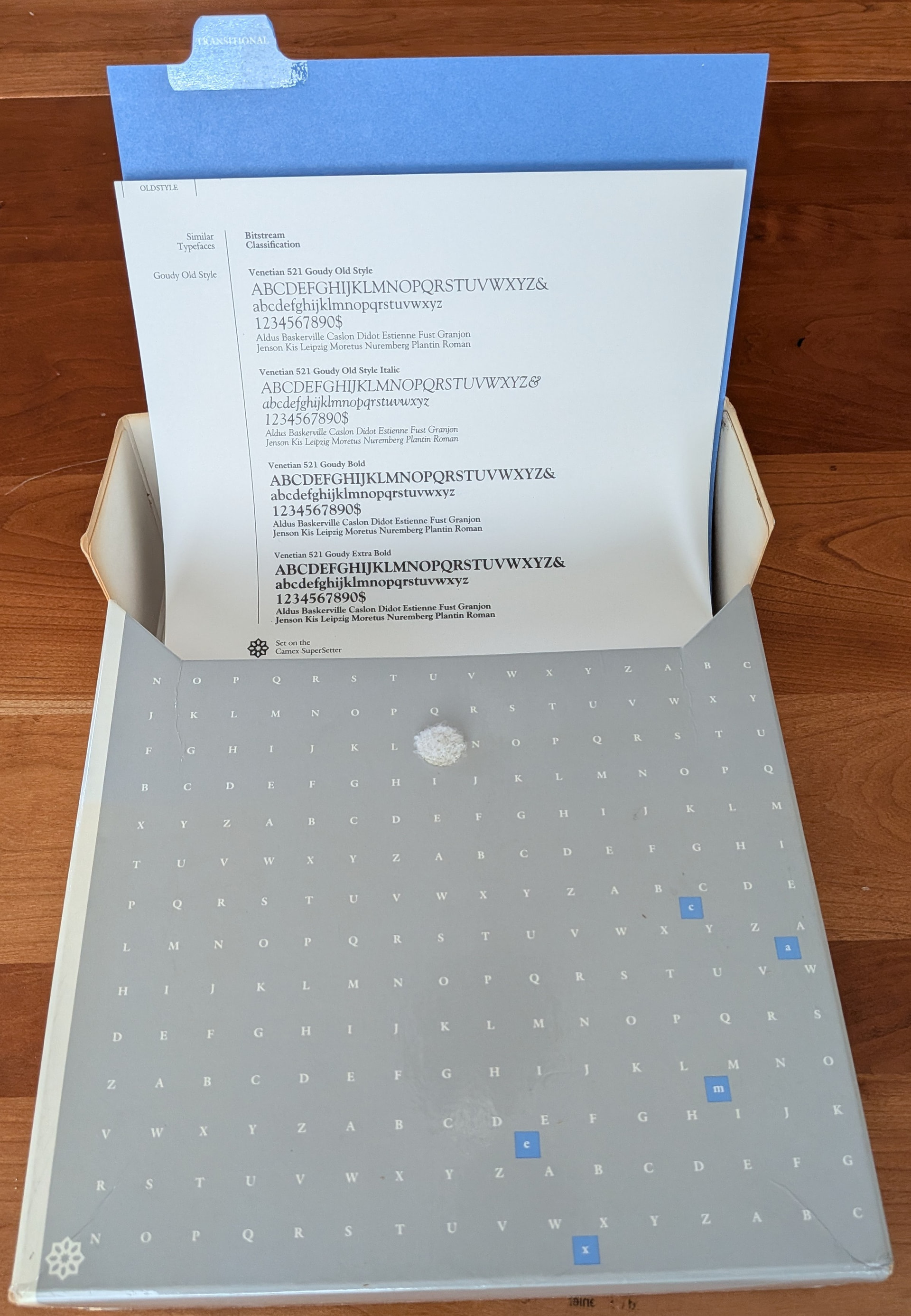 The executives at Mergenthaler were no exception, but the type design department was intrigued. “You mean fonts are software, not tied to hardware? We can get behind that!” So we crafted an agreement: the designers left Mergenthaler and formed a new company, BitStream. Camex (mostly Jim Flowers) built a font-design system called the Letter Input Processor based on the 1351 platform. We gave BitStream a few machines in exchange for rights to the first 50 fonts they produced. Those fonts were the original Camex type library. Samples of each font were printed on cards about 8"x8", and stored in a nice box.