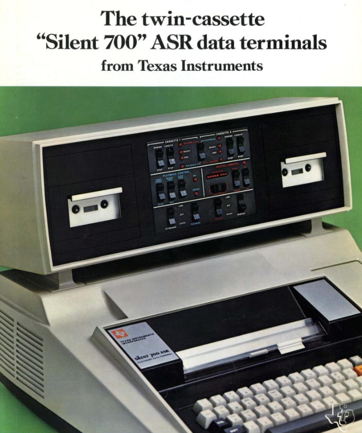 I recognize the Texas Instrument Silent 700 printing terminal, which prints using a 5x7 dot matrix on thermal paper. It has dual cassette tape drives in the large rectangular object that is black in the front.
